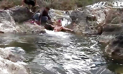 Light haired hot tramp attacked lengthy dick of weird dude right on stone riverbank