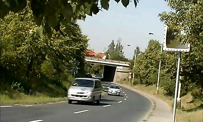 Sweet and fantastic German village girl spreads her gams on the hood of the car