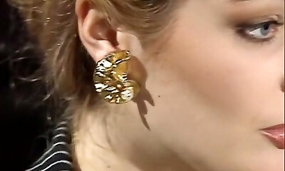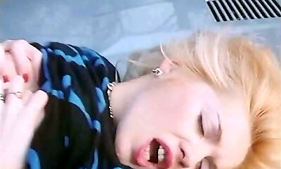Mouth-watering and busty classic blondie licking dick of a big guy